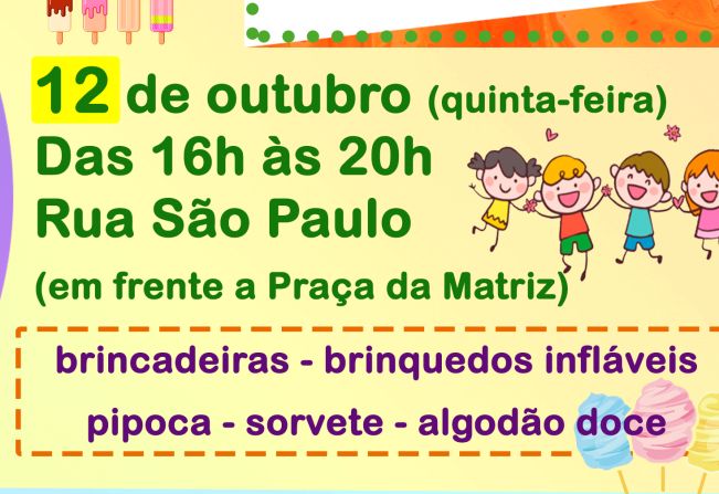 A Rua do Recreio, um evento especial para comemorar o Dia das Crianças, será realizado na rua São Paulo – em frente a Praça da Matriz , no dia 12 de outubro – quinta-feira, com inicio às 16h e encerramento às 20h.